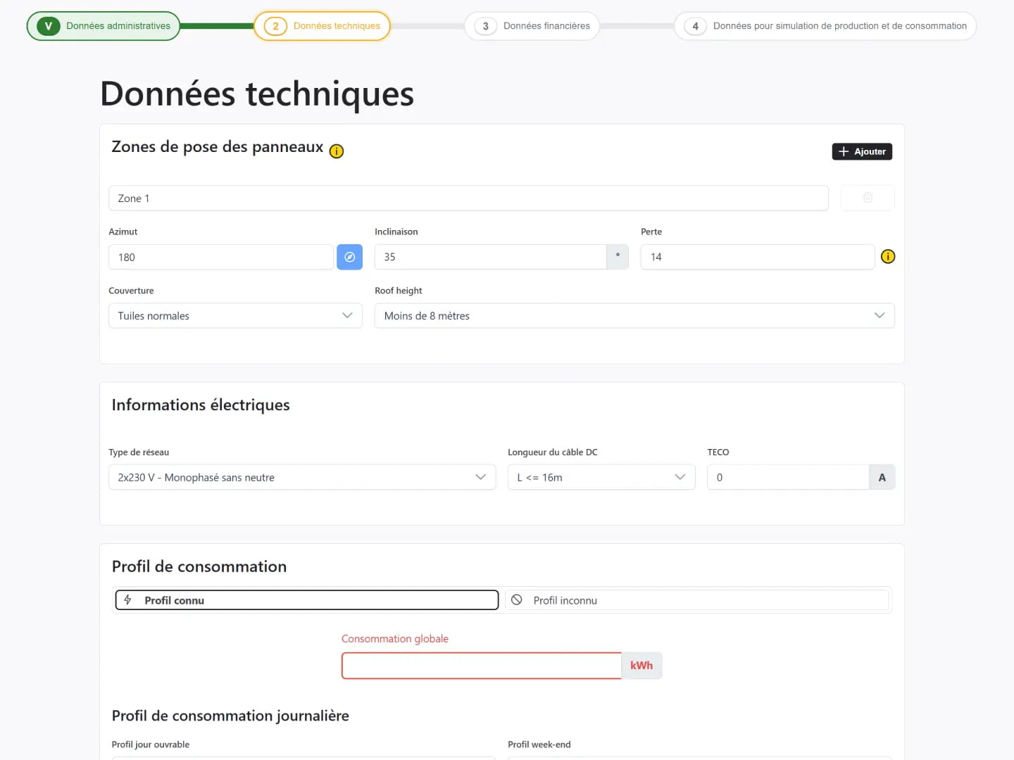 Fini les dimensionnements approximatifs. Walter intègre batteries, profil de consommation, azimut, inclinaison, géoposition, prix de l’électricité, inflation… pour produire des simulations précises et enrichir vos offres.