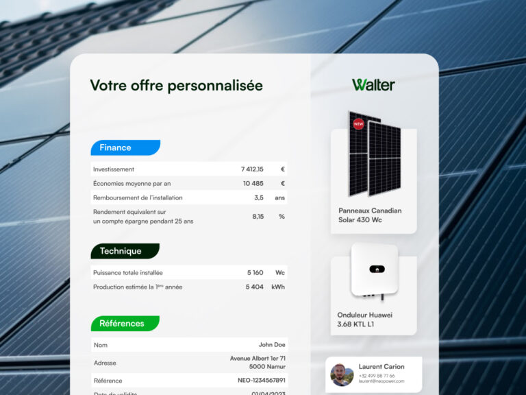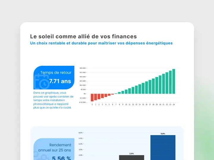 Walter vous donne une estimation du temps de retour sur investissement, des économies et des gains générés par l’installation photovoltaïque de votre client.